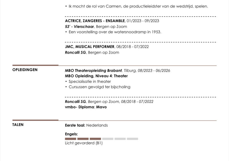 Mijn positieve mindset en flexibiliteit zorgen voor een fijne werksfeer. Ik denk graag mee over verschillende manieren om scènes te interpreteren en uit te voeren. Ik streef ernaar om in toneelstukken en muziektheaterstukken te spelen waarin ik zowel mijn muzikaliteit als mijn liefde voor acteren kan combineren.